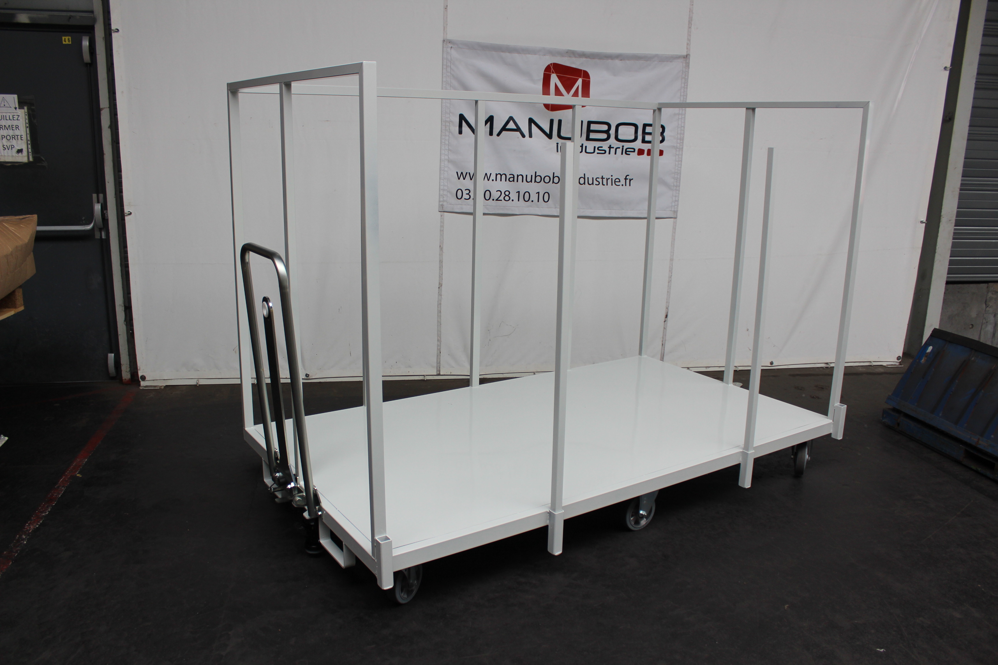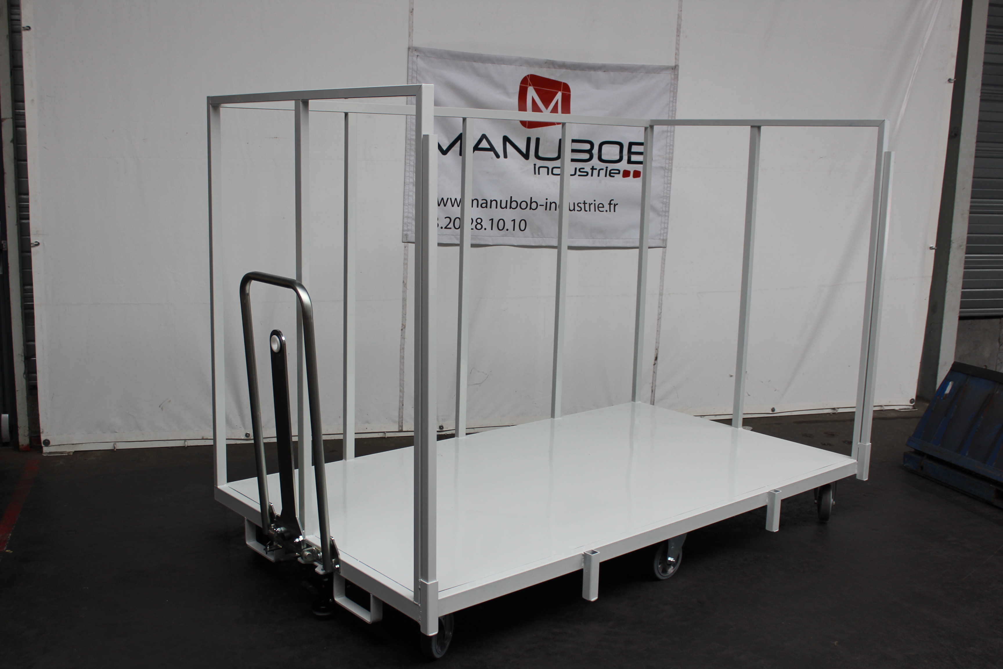 Optimisez la logistique de votre atelier ou de votre entrepôt avec ce chariot de manutention spécialisé pour la laine. Conçu pour allier robustesse et flexibilité, il s’adapte instantanément à vos besoins de stockage et de transport, que ce soit pour une manipulation manuelle ou motorisée.